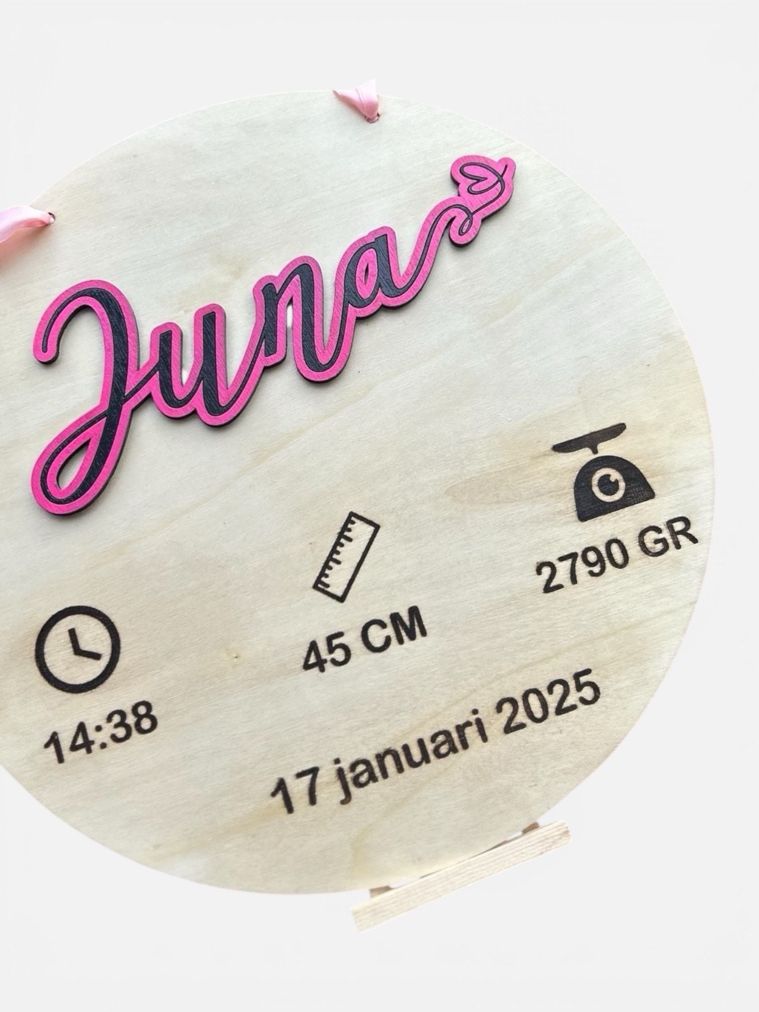 Vier de komst van jullie kleintje met een prachtig geboortebord. Met een stijlvol ontwerp met de naam en geboortedetails van de baby erop gegraveerd, maakt dit bord elke geboorte extra feestelijk.