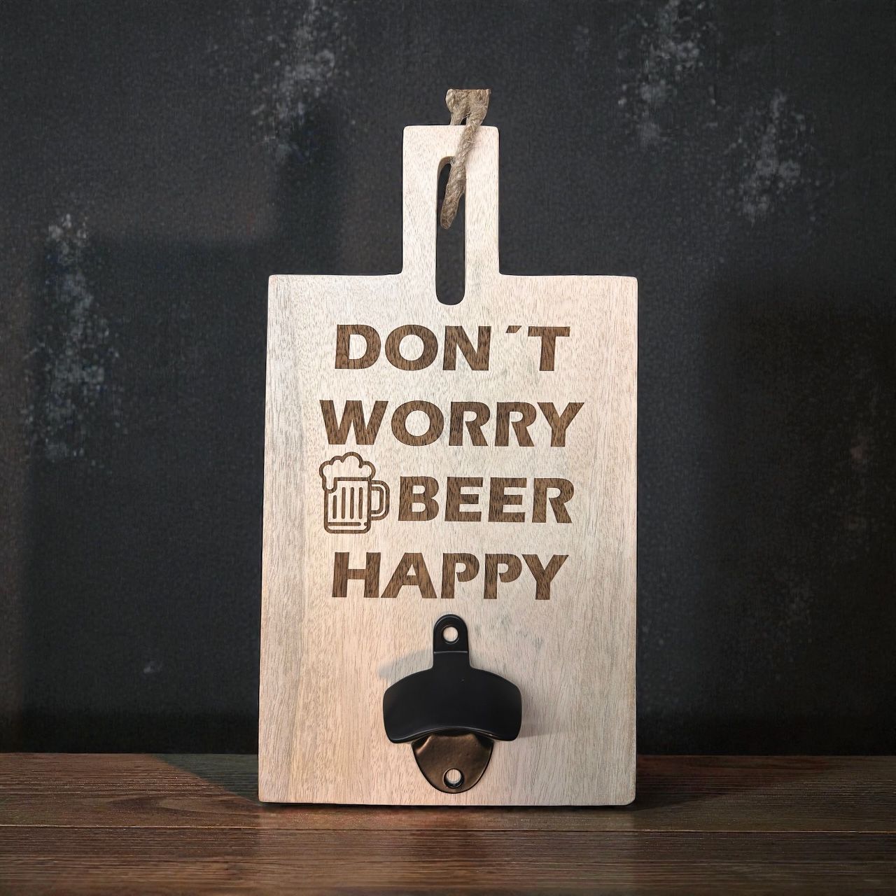 Open je biertje nu nog leuker met dit gezellige plankje. Leuk om op te hangen in de man cave of in de keuken. Don't worry beer happy.